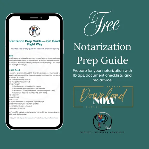Created for clients by Riqueza Business Ventures™ LLC — the Bay Area’s trusted mobile notary for estate plans, real estate, and legal documents.